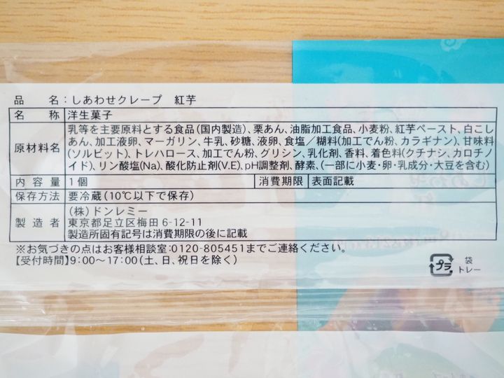 このクレープには沖縄県産の紅芋を使用したスイートポテトと、紅芋風ホイップが包まれているとのこと。原材料名を見ると、紅芋ペースト以外に栗あんや白こしあんなどが入っていて、和菓子のような味わいを楽しめそうな予感。