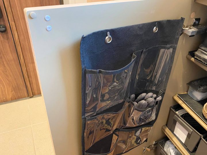 これら動作がスムーズに行えるように、玄関ドアにペーパーカッターをマグネットで貼り付けて、下駄箱の中にはゴミ箱・ビニール紐を置いています。