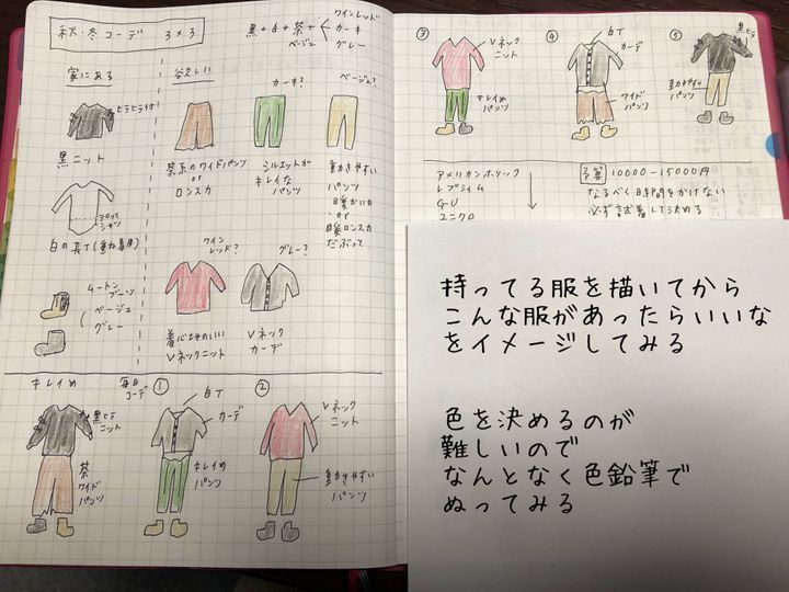 そしてネットでおしゃれなコーデがないか、参考にしつつ、自分が飽きずに着そうな服を書いてみます。