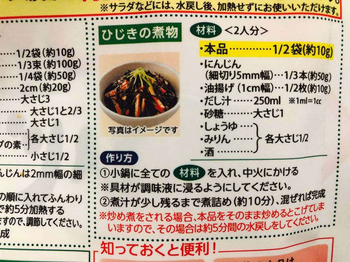5人家族の我が家では、くらこんの「水戻し不要芽ひじき」(内容量21g)を1回につき1袋使っています。