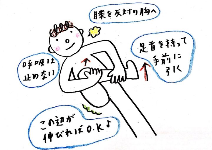 イラストのように、仰向けで膝を抱え、膝を反対側の胸に近づけるように持っていきます。