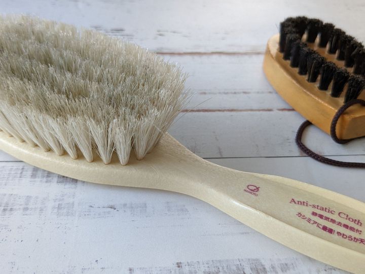 天然毛に静電気除去繊維が混ざった柔らかめのブラシです。