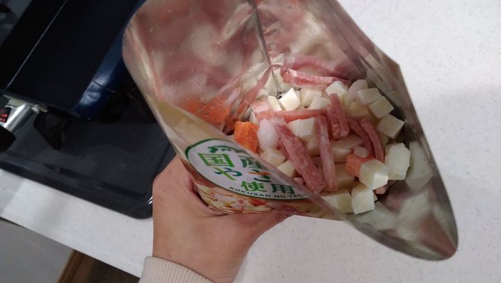 だから、お鍋にお水とコンソメを入れてこの野菜ミックスを入れるだけ。まな板も包丁も使わず、5分くらいでスープができてしまうんです。さらにコクとボリュームを出す場合はソーセージを追加することもあります。これで野菜を出せない「罪悪感」から解放されています…。