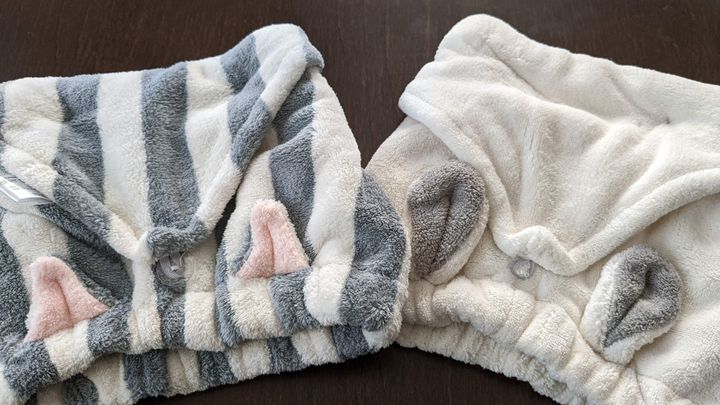 ちなみにしまむらで1枚500円程度で購入しました。綿タオルの約3.5倍の給水量とのことで、かぶって放置し、その間着替えやスキンケアを済ませます。脱ぐ前にかぶったまま地肌を軽く拭いてあげるとあっという間に半乾き状態になります。動物の耳が付いているのがすごくかわいくて、子どもも喜んでかぶってくれます。