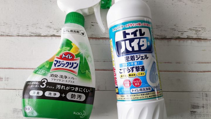 そのような理由から、便器内の汚れが気になった場合はかけて流すだけのトイレハイターを、便座や床・壁はトイレマジックリンを使うようになりました。それぞれのボトルがコンパクトなので、トイレに備え付けの棚に収納して床には物を置かないようにしています。