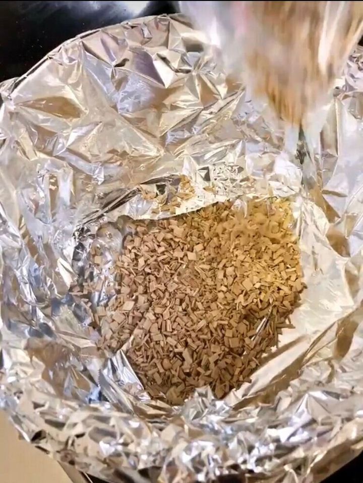①フライパン(鍋)にアルミホイルを敷いて、その上にスモークチップを載せる。
