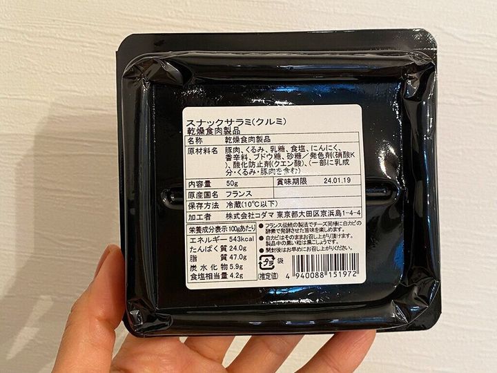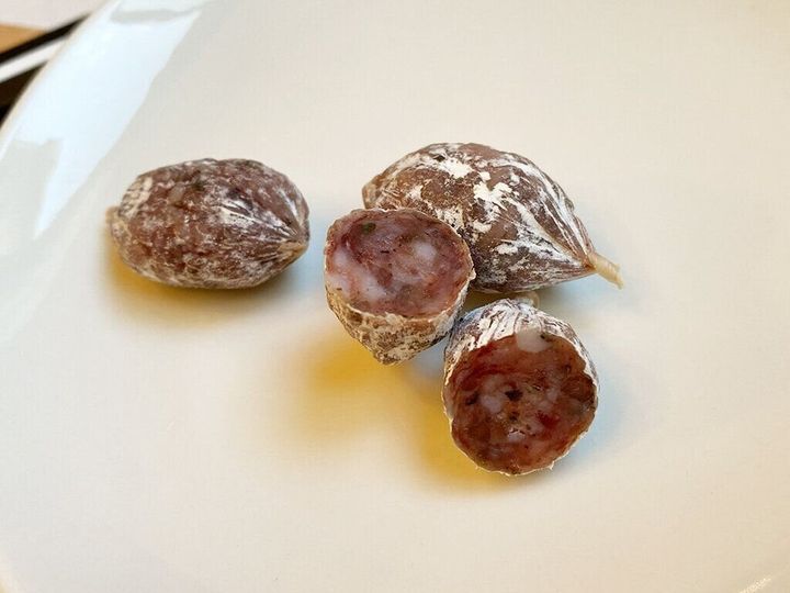 胡桃が入っていて、食べた後に胡桃の風味がふわっと口の中に残るのが癖になるサラミです。