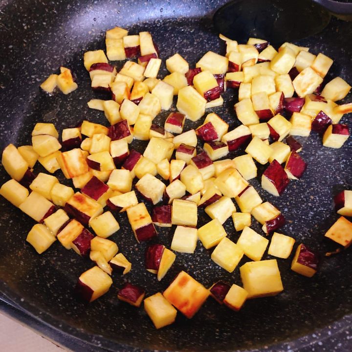 油を敷いたフライパンに、さつまいもを重ならないように広げて中火でこんがり火が通るまで焼いたら、
