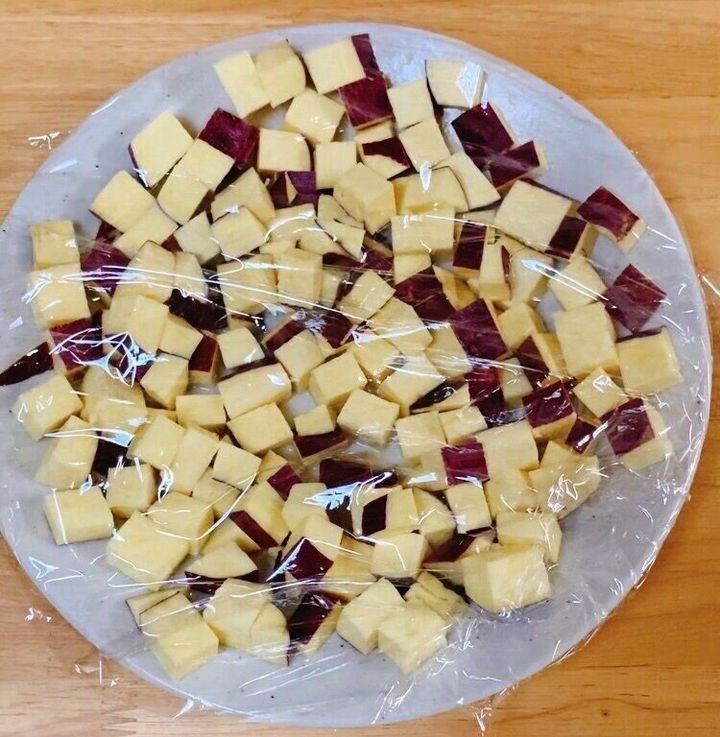 さつまいもを1cmくらいの角切りにして水にさらし、水気をとったら耐熱皿に平らに並べ、ラップをしてレンジ(600w)で3分加熱する。