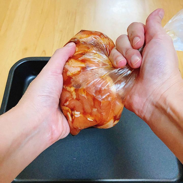 その間に、鶏肉を大きめの1口大に切ってポリ袋に入れ、塩コショウ・みりん・しょうゆを入れてもむ。