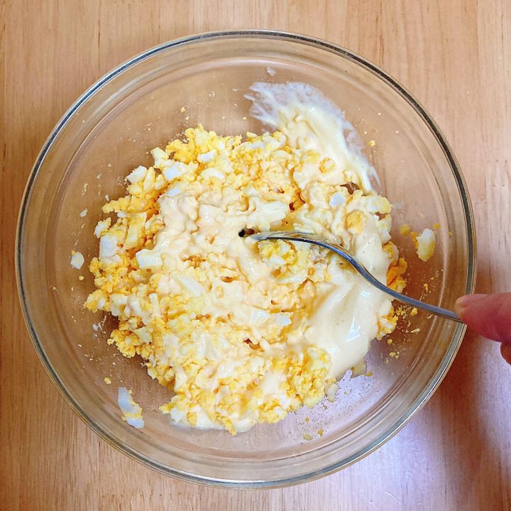 ゆで卵をつぶし、塩コショウ・マヨネーズを混ぜる。