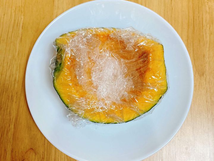 カボチャのタネとワタを取ってサッと水に通し、ラップに包んでレンジ(600w)で5分加熱する。