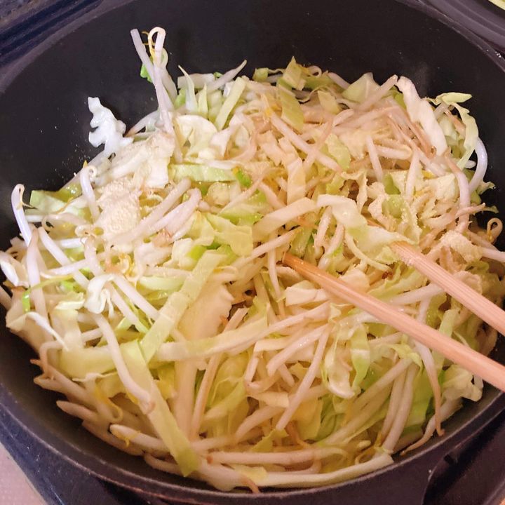 もやしを洗い、キャベツを千切りにして油を敷いたフライパンで2分ほど中火で炒め、鶏がらスープの素を全体に混ぜる。