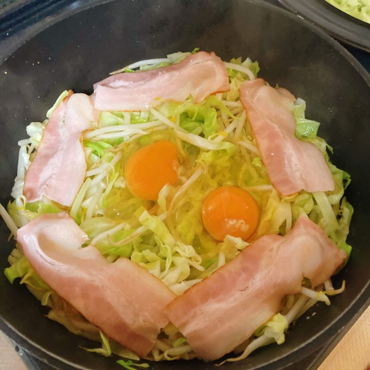 くぼみを作って卵を割り、ベーコンを並べてフタをして火を通す。