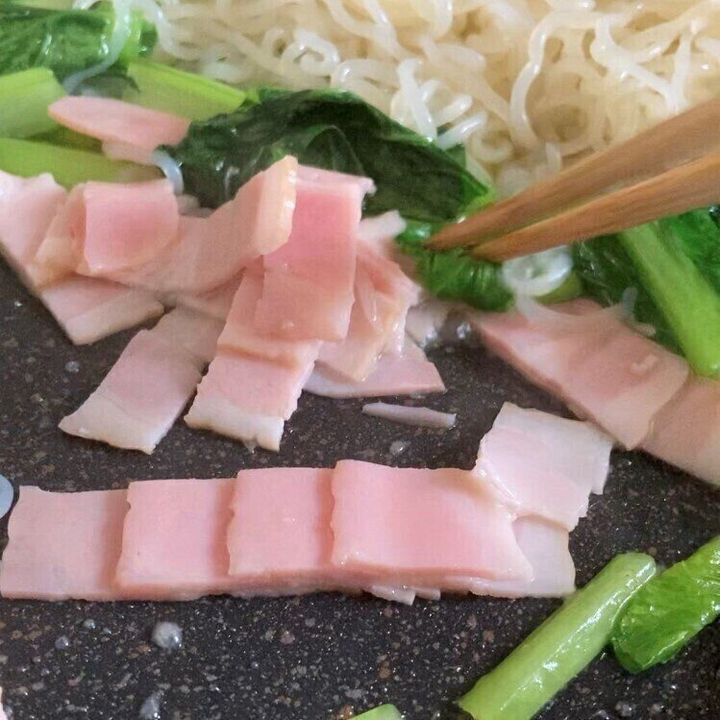 しらたきをサッと洗い、小松菜も洗って4㎝程度のざく切りに、ベーコンは1㎝幅に切る。