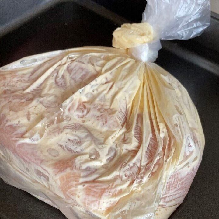 ポリ袋の中で砂糖・にんにく・マヨネーズをもみ込み5分置く。