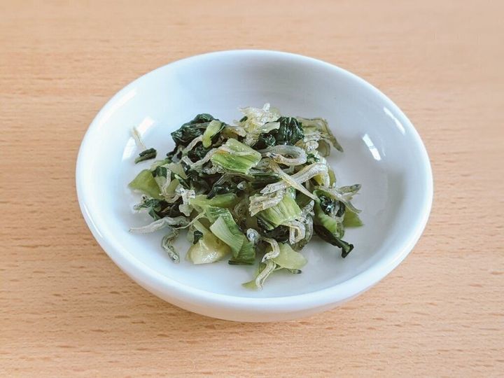 水分の少ないかちりじゃこは常備菜に便利。青菜はかさかさになるまで炒めると水っぽくならず、お弁当にも入れやすくなります。この日はチンゲン菜でした。