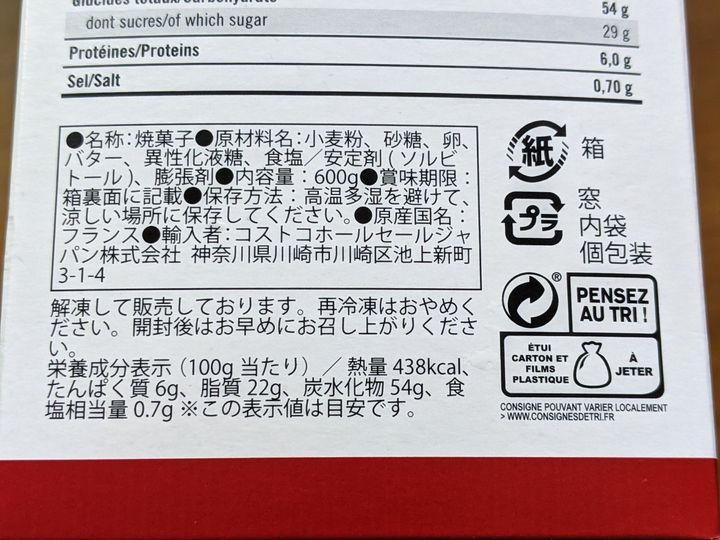 たまたまディスカウントになっていて、なんと600グラム入りのマドレーヌを¥498で購入できました。賞味期限が10月6日と短めだったことが安い理由かもしれません。