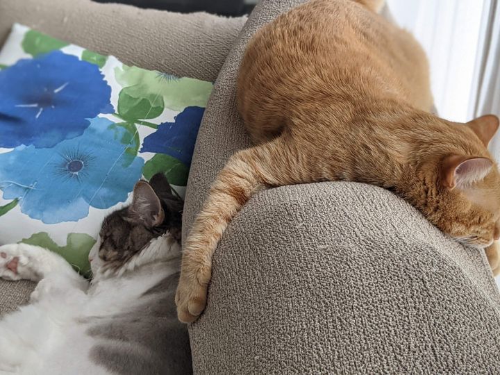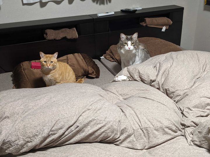 予算をケチるために寝室のカーテンはレールですが、愛猫たちはカーテンを伝うことに興味はないようです。