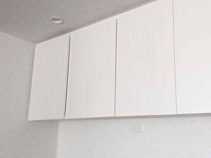 天井のデッドスペースに棚を設置してもらいました。ふだん使わないものや裁縫道具などこまごましたものを収納するのに役立っています。オープン棚に雑貨や観葉植物をのせて・・・なんて憧れますが、ねこに見られたらまず落とされます。我が家では小物を飾るのは諦めて、収納はクローズタイプが基本です。