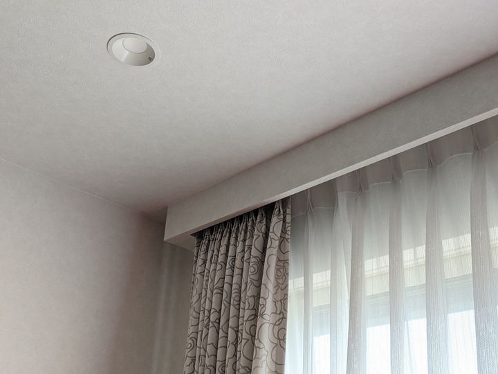 カーテン周辺がねこにとって魅力的に見えないよう、リビングのカーテンはレールでなくボックス式を採用しました。カーテン周りで遊ぶかは個体差があると思われますが、ねこがレールの上を歩いたり、カーテンをよじ登ったりすることを恐れて取り入れたものです。