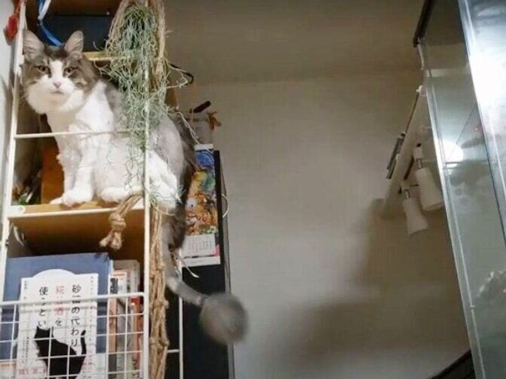 本棚くらいはオープンでいいだろう・・・と設置したら、すぐに乗っ取られました。右側のピアノ(黒いところ)からすき間にジャンプしてアピールしてきます。足腰に悪そうなのでやめてほしい。