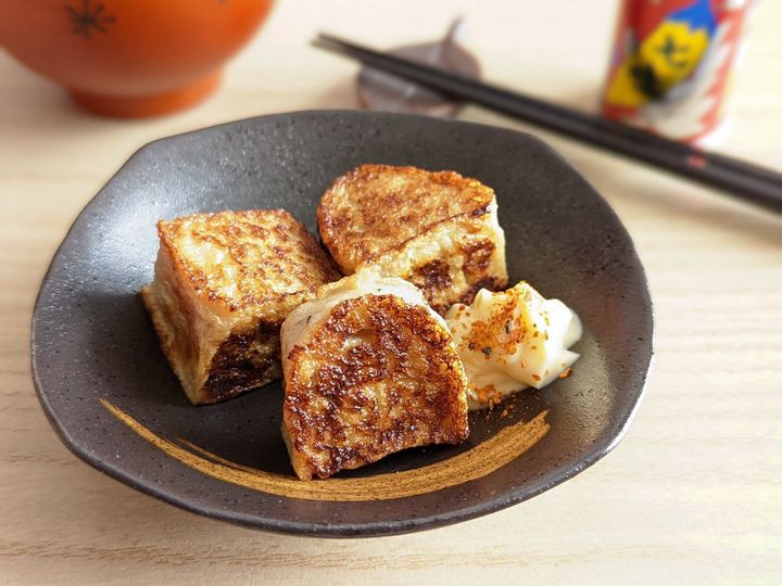 まずはシンプルに焼いておつまみに。余分な味付けがされていないので、好みの調味料でいただきます。今回は七味唐辛子とマヨネーズをつけました。焼いた面はぶりん!と弾力があり、中はふわふわとした食感です。