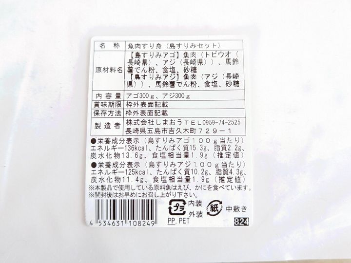 コストコの鮮魚コーナーで見つけた魚のすり身です。袋にすり身が詰められているシンプルなパッケージ。原材料も魚とでん粉、調味料とシンプルです。