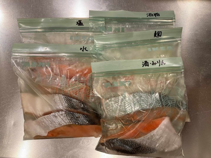 の順番でした。塩水も旨味は残りましたが酒とみりん以降は脂も程よく残り、旨味も強く残っていました。私の好みですが、焼き鮭としてバランスが良いのは麹でした。酒粕を使った塩抜きは、塩が抜けておいしいのですが、西京焼きにやはり近いので好みが分かれる印象です。
