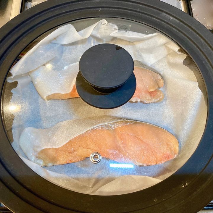 ちなみに我が家は掃除がめんどうという理由でグリルが無いのでフライパンにクッキングシートを敷いて焼き上げています。フライパンでも簡単に十分おいしく焼けますよ。