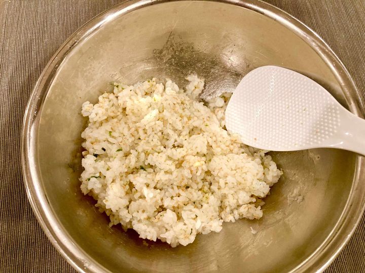 このおにぎりでポイントはフリーズドライお味噌汁を粉々にすることです。キューブ型のもの、顆粒のものどちらも具材、味噌共に袋を開ける前によく揉み込んで粉々にしてください。粉々にしたフリーズドライ味噌汁をご飯にかけてよく混ぜます。全体に味が馴染んだらおにぎりを成形して出来上がり!