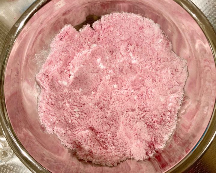 ・ボウルに塩を入れます。食紅、アロマオイルはここでお好みの分量入れます。