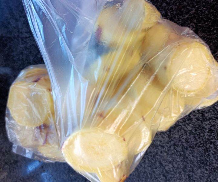 1. さつまいもの皮を剥いて適当な大きさにカットし耐熱袋に入れます。