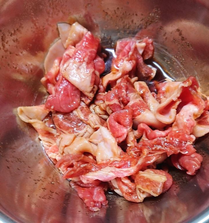 2. 豚薄切り肉をタレにいれて味を肉にしみこませる。