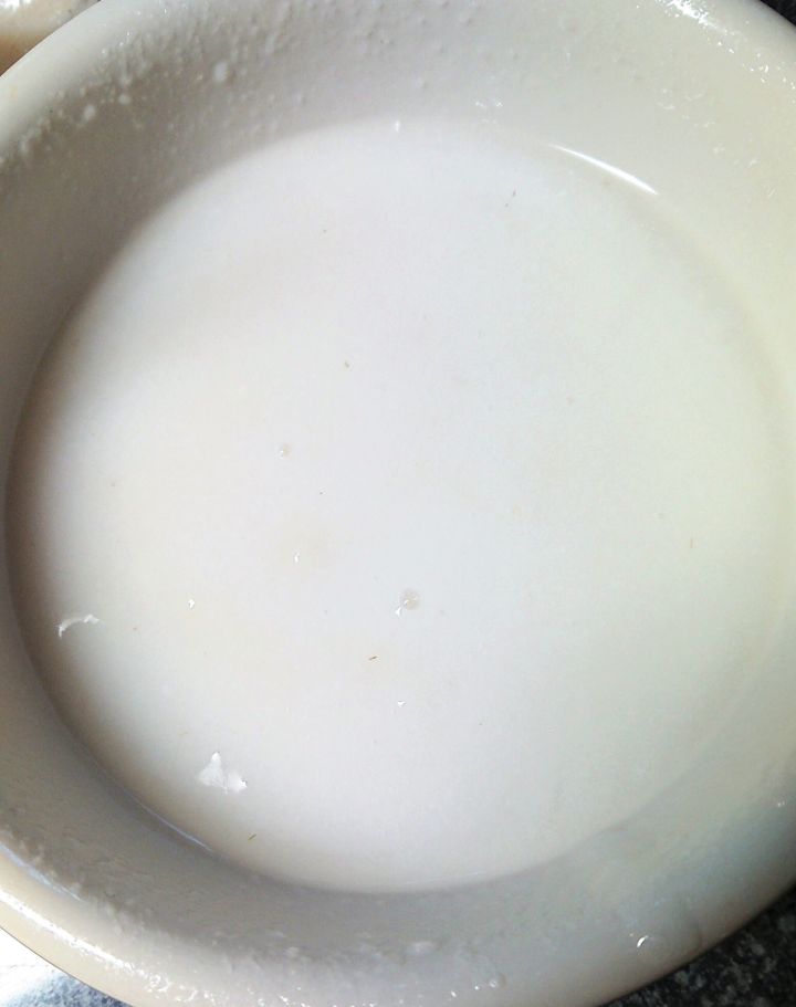 2. レンジから耐熱皿を出し、後入れの水を加えて溶かしながら混ぜる。