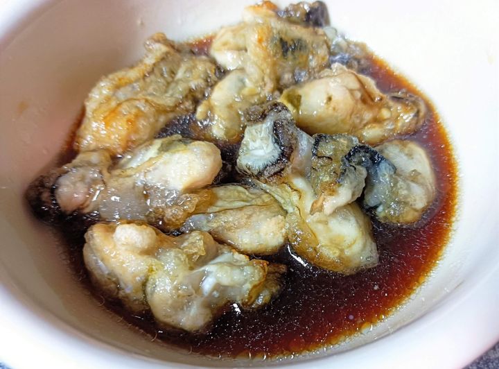 牡蠣の周りに絡めた片栗粉にタレがしみ込み、トロっとしながらも味がしっかり牡蠣に絡まり、ご飯のお供としても最高です。