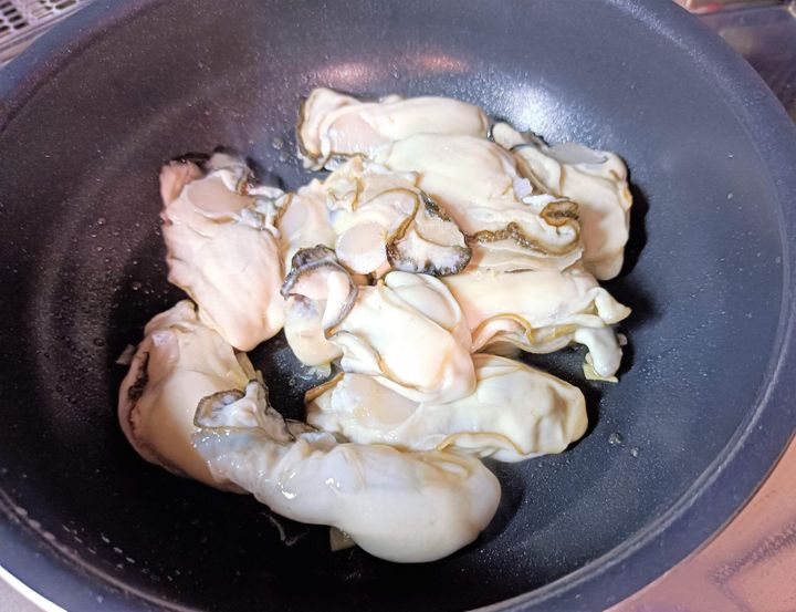 2. フライパンにガーリックオイルを入れ、そこに牡蠣を入れる。