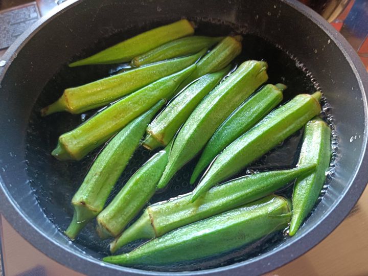 3. たっぷりのお湯に塩を一つまみいれます。沸騰したお湯でオクラを約1分茹でます。