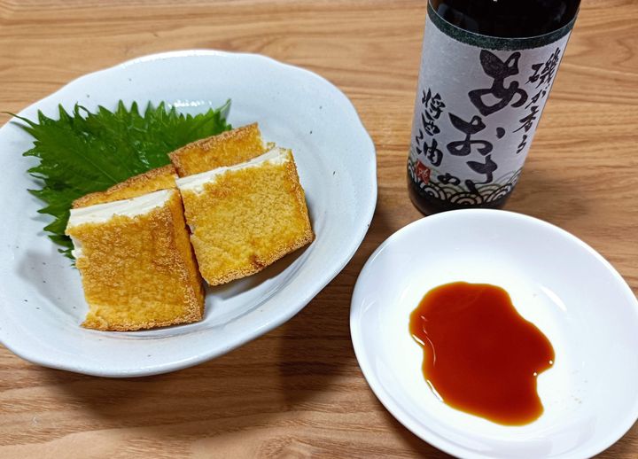 厚揚げをフライパンで軽く焼き、「磯が香る あおさの醤油」を付けて楽しんでみました。