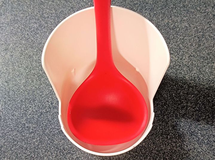 たとえば、定番のお玉。取っ手が長いお玉やフライ返しは、このように置くことができます。