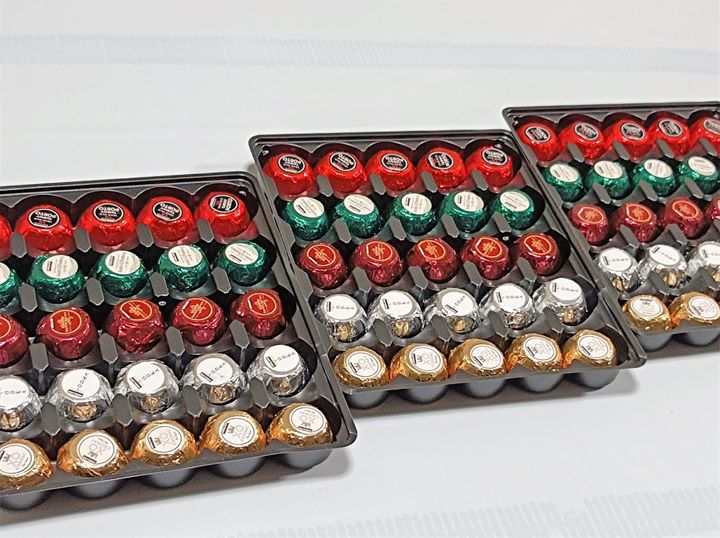 ポートワイン、アイリッシュウイスキー、スコッチウイスキー、ウォッカ、コニャックの5種類のお酒が入っています。また、チョコレートはベルギーのダークチョコです。