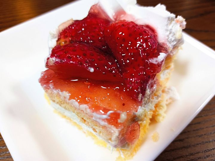 ふわふわなスポンジに、2種類のホイップクリームとカスタードクリームがたっぷりと挟んであります。また苺もたくさんのっています。