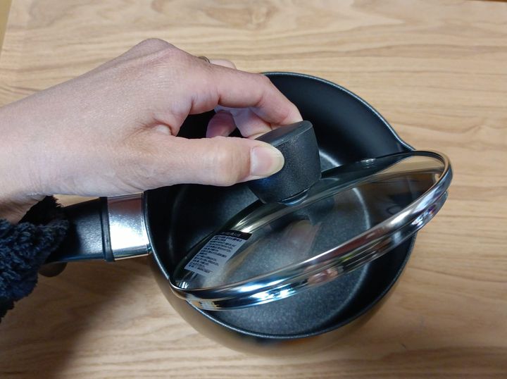 蓋を少し飛び出た注ぎ口の部分から斜めに入れると、蓋を鍋の中に収納することができます。