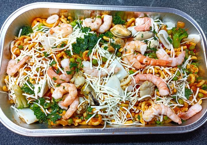 美味しく野菜もシーフードもたっぷり摂れる「シーフードパスタパエリア」はおすすめです。