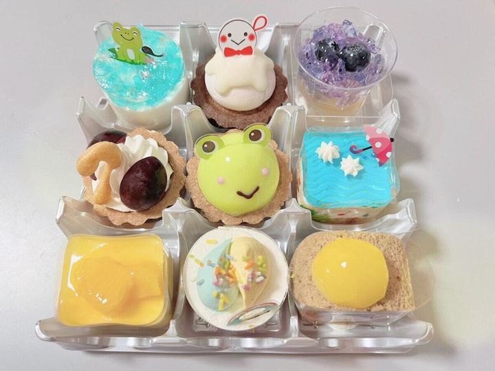 カエルや天気をモチーフにした可愛いケーキが並んでいます。