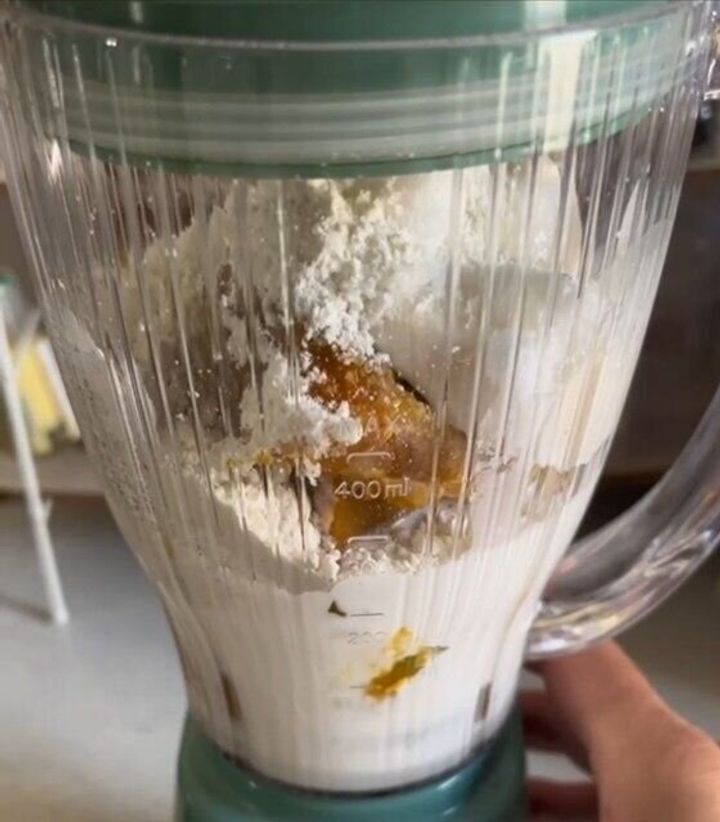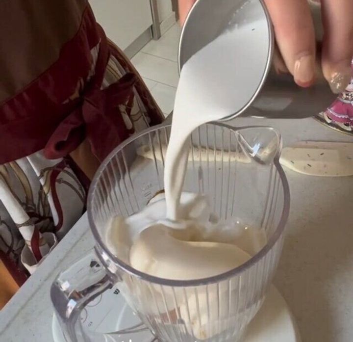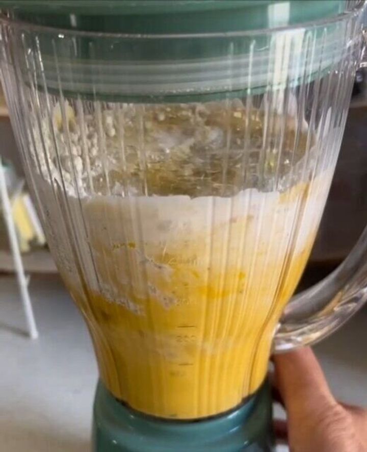 生クリームも卵も全てミキサーの中へいれ、砂糖、薄力粉の粉類も入れます。