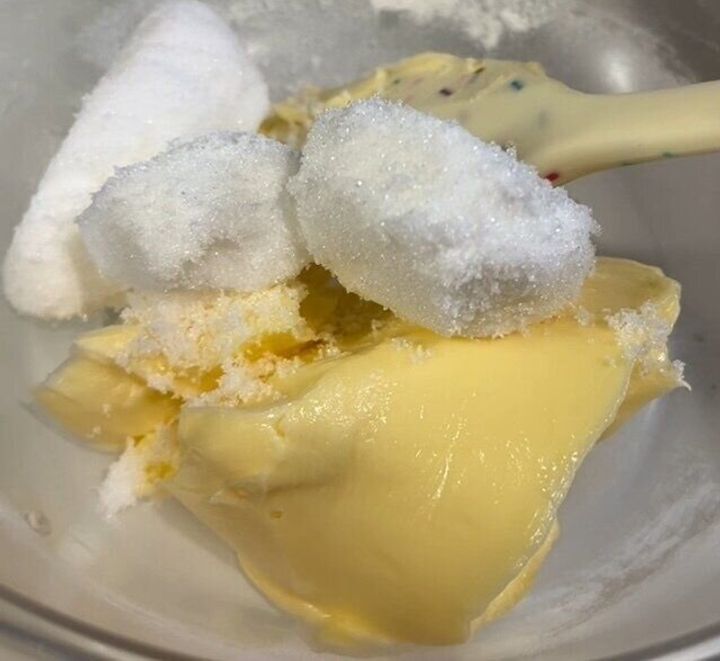 ボウルに砂糖、マーガリンを入れる。マーガリンは作る前に常温にしておくと時短になります。