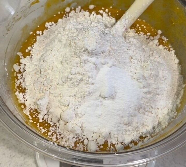 卵がよく混ざったら、薄力粉とベーキングパウダーを振るって入れる。