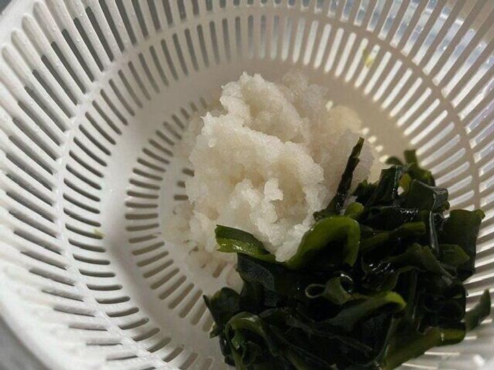 大根をすりおろします。ザルにのせながらすりおろすと水切りも同時に出来ます。