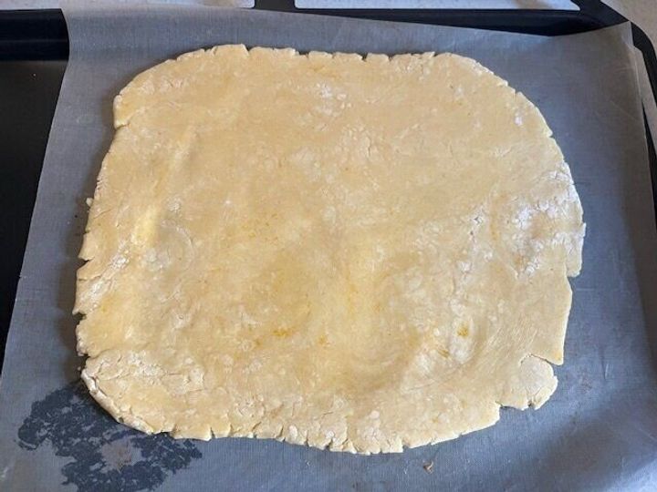 5.冷蔵庫から取り出した生地は薄めにオーブンの天板くらいの大きさに伸ばす。